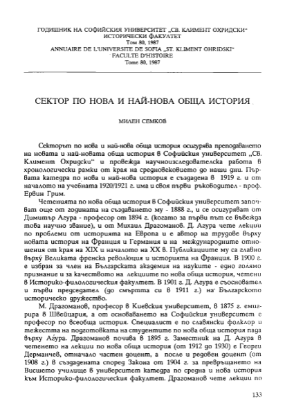 Semkov, M. Universitetskata shkola po nova i nai-nova obshta istoriya (1919–1988). – V: Godishnik na Sofiiskiya universitet “Sv. Kliment Okhridski”. Istoricheski fakultet, t. 80, 1987, 133–144.