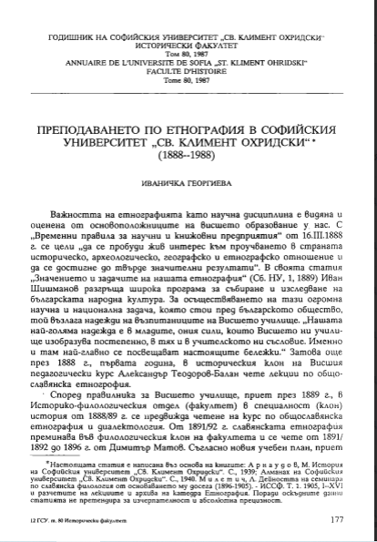 The article by Ivanichka Georgieva presents a comprehensive overview of the development of ethnographic teaching at Sofia University “St Kliment Ohridski” over a hundred-year period (1888–1988). It traces the institutional and methodological formation of ethnography as an academic discipline and its relationship to other fields within the humanities and social sciences.