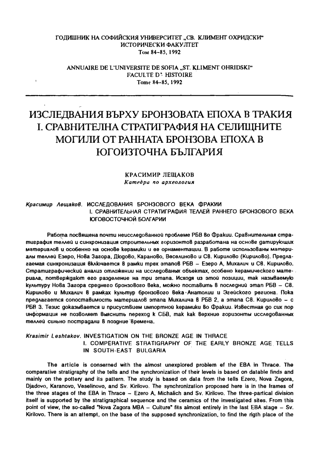 Изследвания върху бронзовата епоха в Тракия І. Сравнителна стратиграфия на селищните могили от ранната бронзова епоха в Югоизточна България