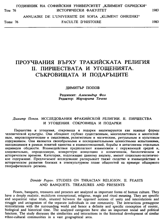 Studies on Thracian Religion II. Feasts and Banquets. Treasures and Gifts