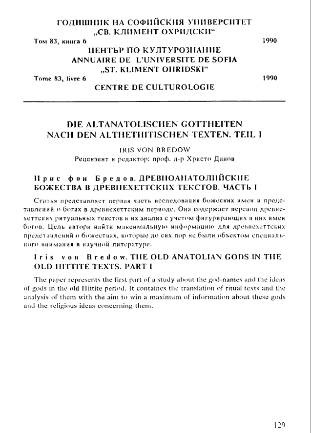 Статията представлява първата част от изследването на божествените имена и представи за боговете в древния хетски период. Съдържа превод на древни хетски ритуални текстове и техния анализ, като се вземат предвид имената на боговете, фигуриращи в тях. Целта на автора е да намери най-пълна информация за древните хетски представи за божествата, които все още не са били обект на специално внимание в научната литература.