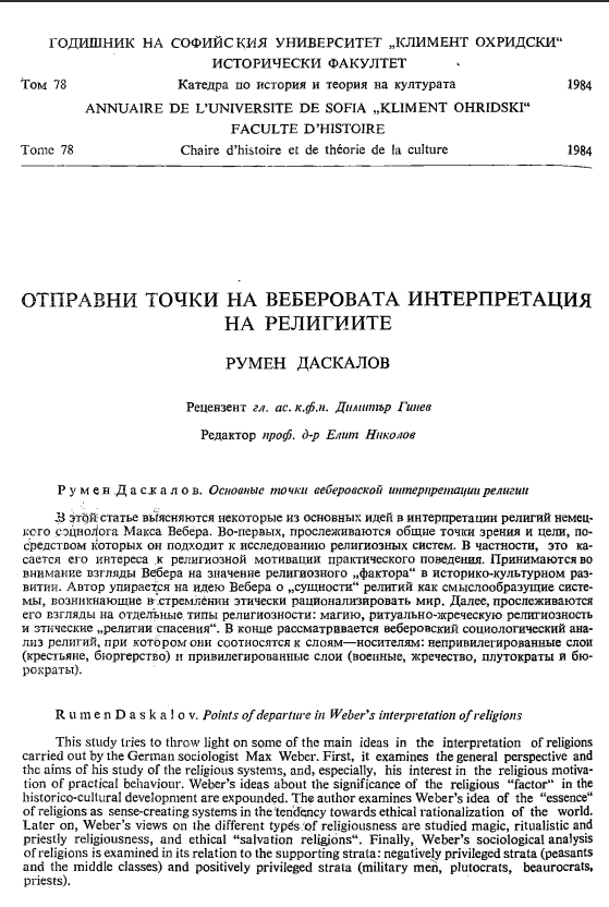 This study seeks to shed light on several key ideas in the interpretation of religion developed by the German sociologist Max Weber. It first examines the general perspective and objectives of his analysis of religious systems, with particular emphasis on his interest in the religious motivation underlying practical behaviour. Weber’s conception of the role of the religious “factor” in historical and cultural development is elaborated, focusing on his understanding of religion as a sense-creating system and its tendency towards the ethical rationalisation of the world. The study then considers Weber’s views on the various types of religiosity—magical, ritualistic and priestly forms, as well as the ethical “religions of salvation.”