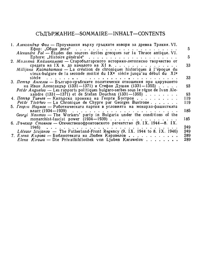 ГСУ-ИФ т. 72 съдържа статии и студии, които хронологически обхващат проблеми от Античността, Българското възраждане и модерната българска история, с резюмета на френски, английски и немски език. Студията на Ал. Фол анализира щателно фрагменти от първата обща история, "Общи дела", с автор Ефор от Куме, които дават ценни сведения за историята на Тракия и траките. Старобългарското историко-летописно творчество от средата на IX в. до началото на XI в. разглежда М. Каймакамова в обширно студийно изложение. П. Ангелов прави анализ на сложните българо-сръбски политически отношения при управлението на Иван Александър /1331 - 1371/ и Стефан Душан /1331 - 1355/. Основна цел на публикацията на П. Тивчев е да бъде представена историята на Кипър чрез превода на хрониката на Георги Бустрон. Преводът е само на български език, без гръцкия оригинал. Г. Наумов разглежда развитието на Работническата партия в България за периода 1934 - 1939 г. Л. Стоянов се спира върху особеностите на монархическия институт в България, ролята на регентството и по-специално при управлението на Отечествения фронт 9.09.1944 - 8.09.1946 г. Ел. Кирова представя съдържанието на библиотеката на Л. Каравелов, като изхожда от разбирането, че книгите дават представа за развитието му като личност - публицист, писател, общественик.