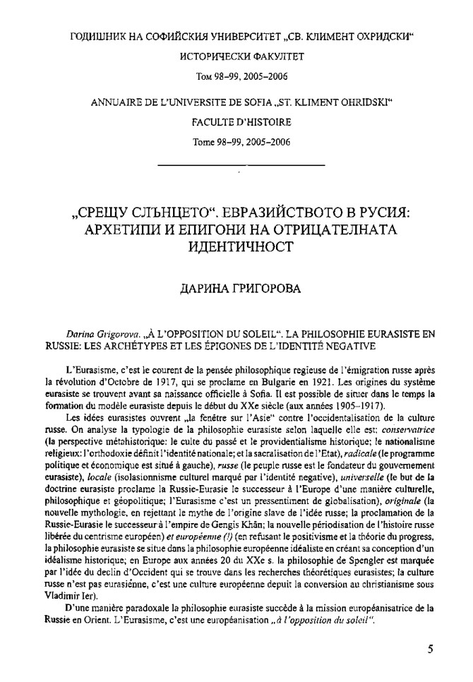 Eurasism is the content of the regious philosophical thought of Russian Immigration after the October Revolution of 1917, which was proclaimed in Bulgaria in 1921. The origins of the Eurasist system lie before its official birth in Sofia. The formation of the Eurasian model can be traced back to the beginning of the twentieth century (1905-1917).